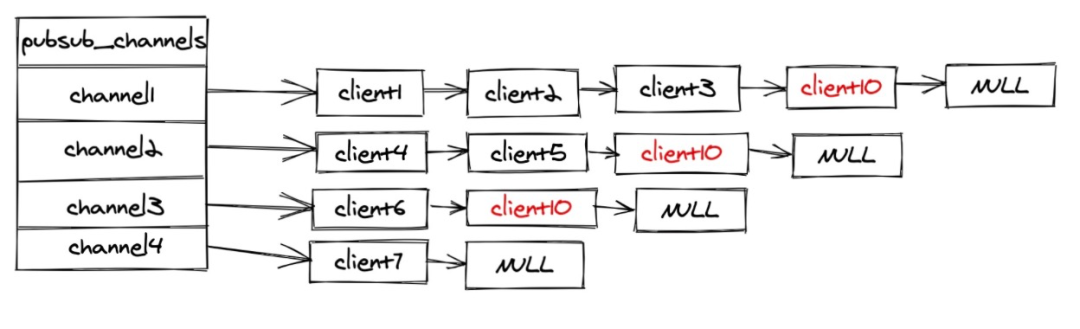 当client 10执行subscribe channel1 channel2 channel3时,会将client 10分别加到 channel1 channel2 channel3关联的链表尾部。