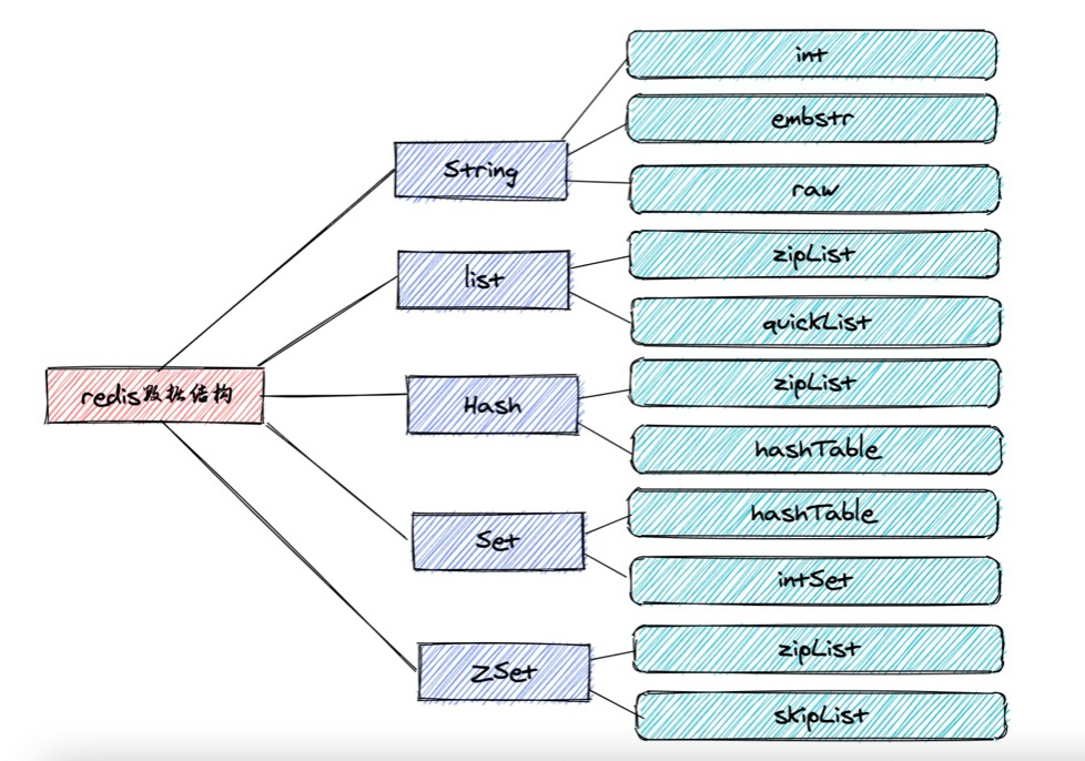 好了,通过redisObject就可以具体指向redis数据类型了,总结一下每种数据类型都使用了哪些数据结构,如下图所示