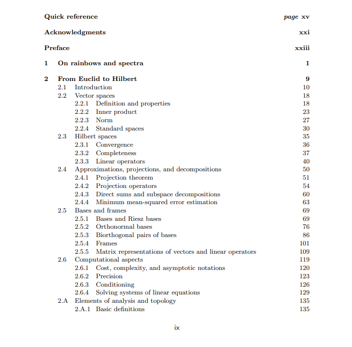 第二章,从欧几里得到希尔伯特,介绍了希尔伯特空间的基本结构。这些向量空间被赋予了可以归纳直观几何性质的操作。在一般情况下,我们提出信号表示的概念,它本质上是向量空间的坐标系。当一个表示是完整的且不冗余的,它为空间提供了基础;当它是完整的和冗余的,它为空间提供了一个框架。基的一个关键优点是正交性;与框架相对应的是紧密性。