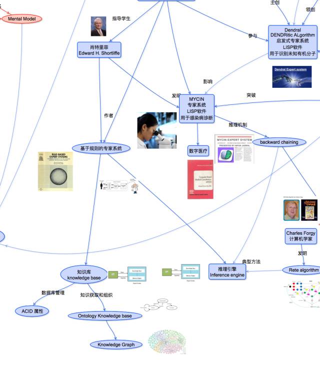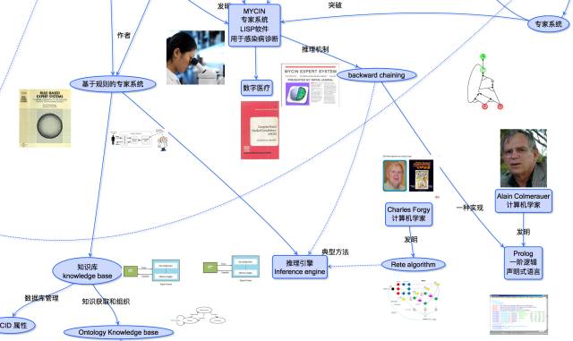 故事依然没有结束, 有了专家系统之后, 大家发现问题都集中到了两个方面, 一是知识的获取和管理, 另一个则是推理引擎。 便有了研究知识库和推理引擎发明的大量投入。 其中MYCIN的backward chaining推理被Colerauer的芬兰计算机学家实现为Prolog语言。 这是人工智能领域专用语言之一。 是声明式语言的典范。另外一位计算机学家Forgy发明了Rete算法, 现在你用到的大部分推理引擎,基本都离不开Rete算法。