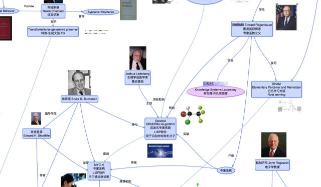 有了EPAM记忆学习的思路, Feigenbaum和斯坦福的同事Buchanan一起, 找到一个应用。 这个应用就是诺贝尔奖获得者Lederberg在基因工作方面的需求:标识从未见过的有机分子。 在这个需求下, 他们三人一起合作开发了第一个专家系统叫Dendral。 这时候LISP语言发展很快,他们已经切换到用LISP语言来实现Dendral。 Dendral某种意义上是GPS和EPAM模型结合的一个具体实现。