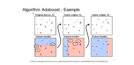 AdaBoost是用于短决策树的,在创建第一个树后,通过每个训练实例上的树的性能来衡量下一个创建的树对每个训练实例分配的权重。难以预测的训练数据将获得更多的权重。