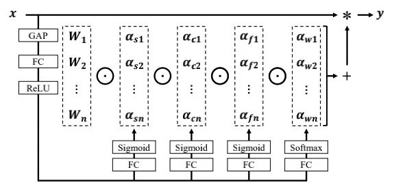 其中, 表示卷积核 的注意力标量,表示新引入的三个注意力,分别沿空域维度、输入通道维度以及输出通道维度。这四个注意力采用多头注意力模块 计算得到。