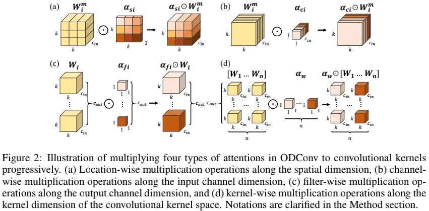 在ODConv中,对于卷积核 , 对 空域位置上的卷积参数赋予不用的注意力值,见上图a; 对不同输入通道的卷积滤波器赋予不同的注意力值,见上图b; 对不同输出通道的卷积滤波器赋予不同的注意力值,见上图c;而 则对n个整体卷积核赋予不同的值,见上图d。