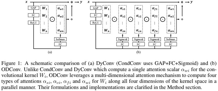 然而,对于CondConv与DyConv来说, 均采用单个注意力标量 ,这就意味着它的的输出滤波器 对于输入具有相同的注意力值。换句话说,卷积核 的空间维度、输入通道维度以及输出通道维度均被CondConv与DyConv所忽视了。这就导致了关于核空间的粗糙探索。这可能就是为什么CondConv与DyConv对于大网络的性能增益较低的原因。