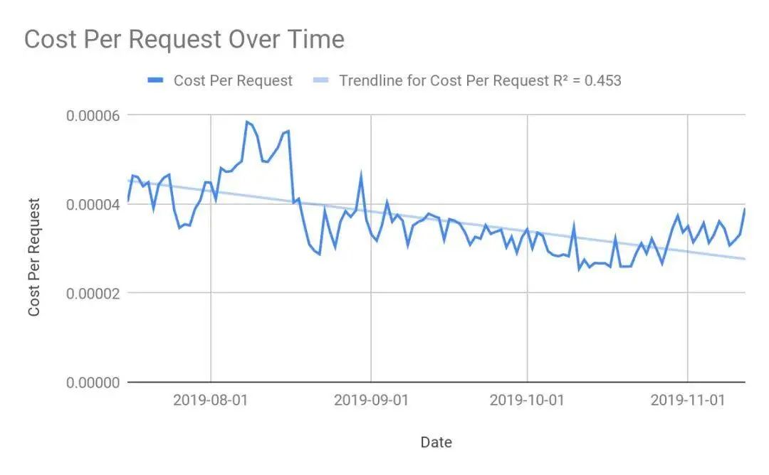 几个月来,每个搜索请求的云成本(云计费总额 / 请求数)显示,我们在 Switchboard 之后,利用效率有所提高。