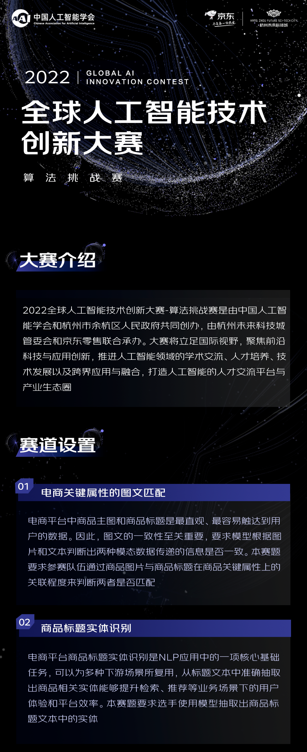 本次大赛从人工智能领域的技术发展与跨界应用与融合出发,开设了电商关键属性的图文匹配和商品标题实体识别两个赛道,以打造人工智能的人才交流平台和产业生态圈,促进人工智能相关领域的创新与发展。