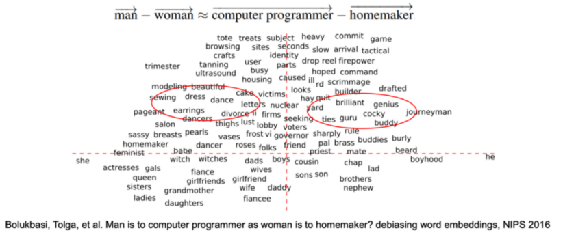 来自 NIPS 2016 的一篇文章发现,从谷歌新闻等比较正式的文体中训练出的词向量,带有非常强烈、令人不安的性别刻板印象。这体现在,语料中男性和女性的差异,相当于程序员和家政工人之间差异。