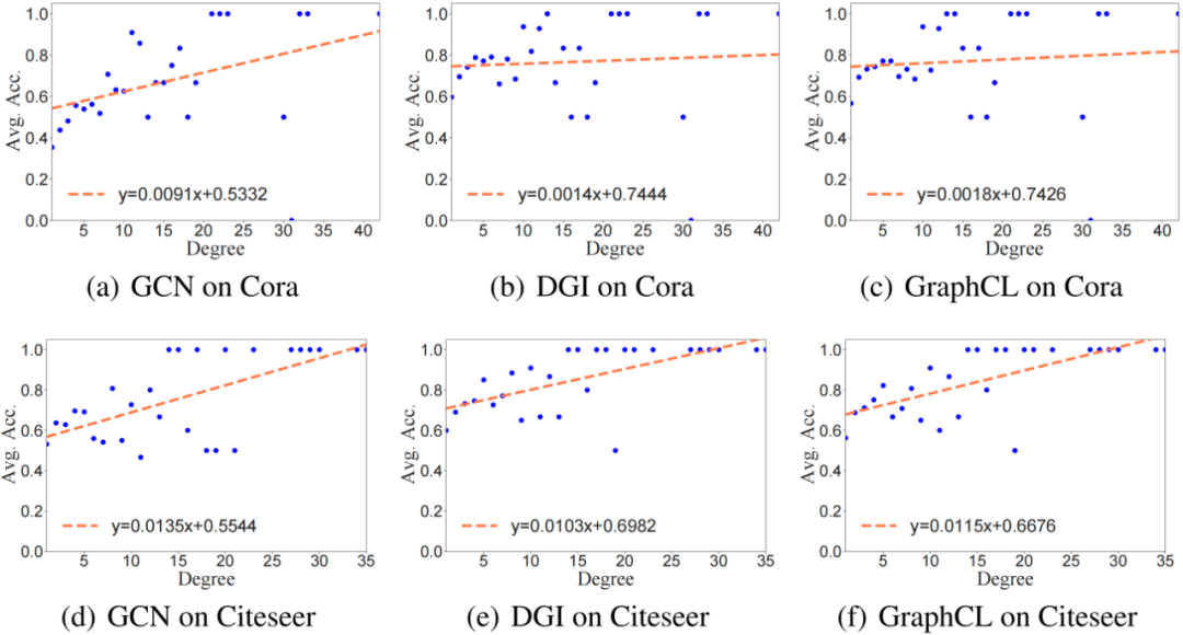 为进一步反映结构公平性,我们用线性回归拟合这些散点,斜率越小,该模型对度偏差越公平。Photo 和 Computer 数据集上的实验结果,参见论文。从图中可以看出,DGI 和 GraphCL 尾节点的平均准确率高于 GCN,且回归线的斜率也较小。这一有趣的现象说明,无监督的 GCL 方法比半监督的 GCN 更具有结构公平性。