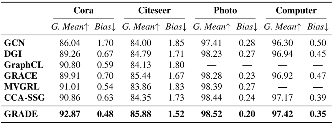 基于这些指标,评估结果如下表所示。可以看出,GRADE 降低了所有数据集的偏差,并保持最高的组平均。