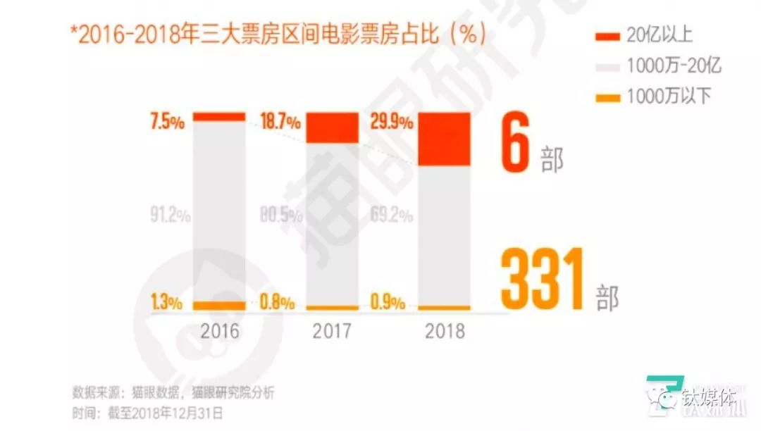 以收入最为透明的电影票房为例,根据猫眼研究院发布的《2018中国电影市场数据洞察》显示,2018年,20亿以上的6部电影贡献了整个市场的30%的票房,1000万以下的电影331部,仅贡献0.9%的票房,票房收入加速两极化趋势,头部效应的趋势持续增强。