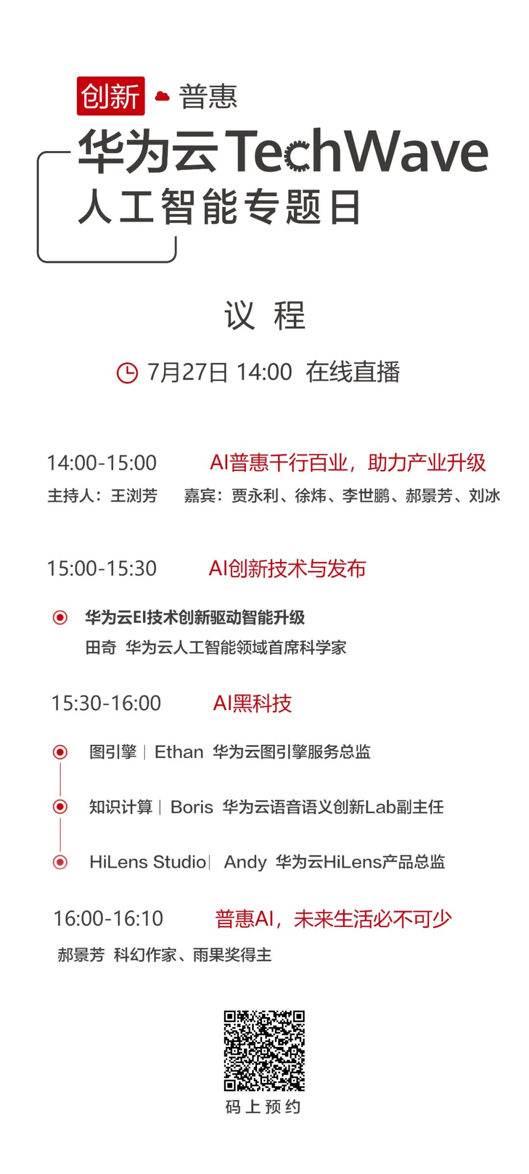 AI 将如何改变各行各业和生活?AI 行业落地的瓶颈有哪些? 如何实现真正用得起、用得好、用得放心的普惠 AI?7 月 27 日,华为云 TechWave 人工智能专题日给你答案。