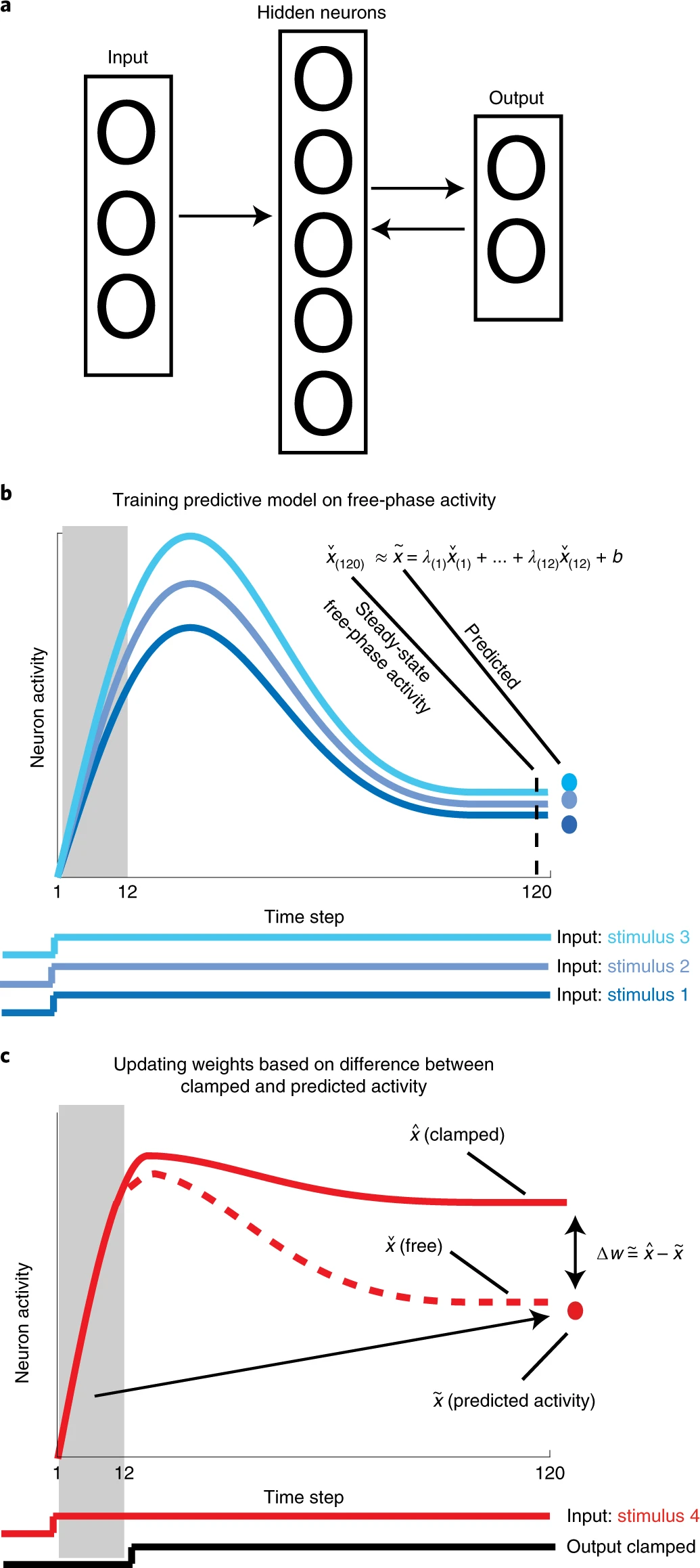 这里的新见解是,最初的自下而上活动足以让神经元预测自由相活动的稳态部分,然后可以将预测的自由相和钳制相(clamped phase)之间的不匹配用作教学信号。