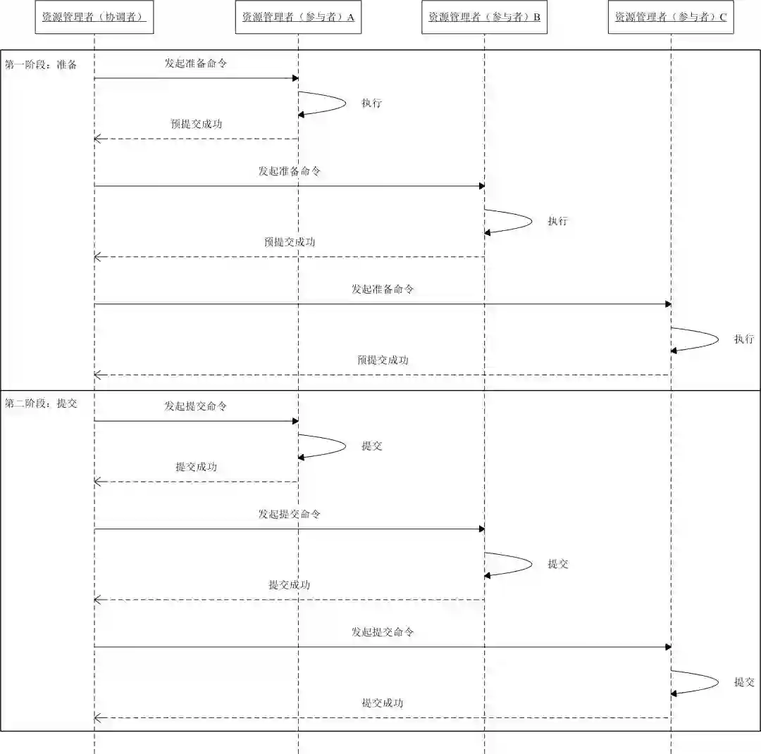 二阶段提交协议,顾名思义,它具有两个阶段:第一阶段准备,第二阶段提交。这里,事务管理者(协调者)主要负责控制所有节点的操作结果,包括准备流程和提交流程。第一阶段,事务管理者(协调者)向资源管理者(参与者)发起准备指令,询问资源管理者(参与者)预提交是否成功。如果资源管理者(参与者)可以完成,就会执行操作,并不提交,最后给出自己响应结果,是预提交成功还是预提交失败。第二阶段,如果全部资源管理者(参与者)都回复预提交成功,资源管理者(参与者)正式提交命令。如果其中有一个资源管理者(参与者)回复预提交失败,则事务管理者(协调者)向所有的资源管理者(参与者)发起回滚命令。举个案例,现在我们有一个事务管理者(协调者),三个资源管理者(参与者),那么这个事务中我们需要保证这三个参与者在事务过程中的数据的强一致性。首先,事务管理者(协调者)发起准备指令预判它们是否已经预提交成功了,如果全部回复预提交成功,那么事务管理者(协调者)正式发起提交命令执行数据的变更。