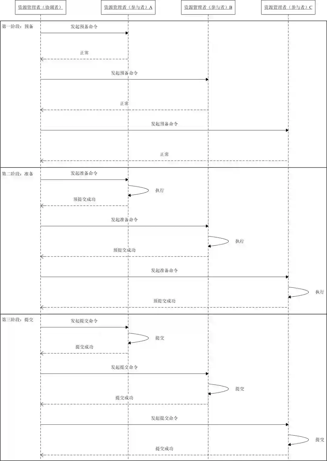 二阶段提交协议诸多问题,因此三阶段提交协议就要登上舞台了。三阶段提交协议是二阶段提交协议的改良版本,它与二阶段提交协议不同之处在于,引入了超时机制解决同步阻塞问题,此外加入了预备阶段尽可能提早发现无法执行的资源管理者(参与者)并且终止事务,如果全部资源管理者(参与者)都可以完成,才发起第二阶段的准备和第三阶段的提交。否则,其中任何一个资源管理者(参与者)回复执行,或者超时等待,那么就终止事务。总结一下,三阶段提交协议包括:第一阶段预备,第二阶段准备,第二阶段提交。