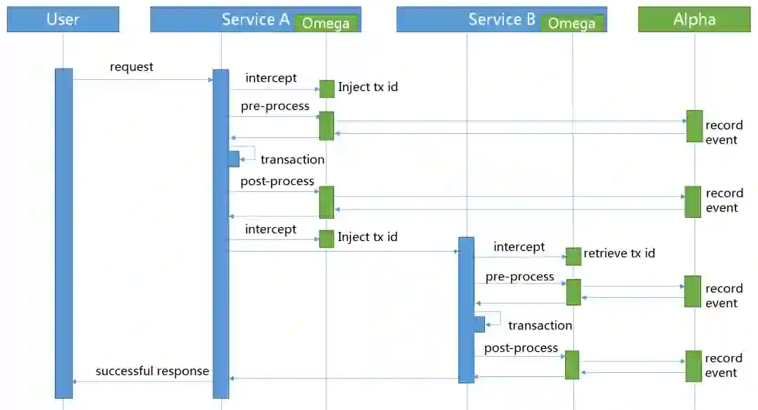 ServiceComb Saga 在其理论基础上进行了扩展,它包含两个组件:alpha 和 omega。alpha 充当协调者,主要负责对事务的事件进行持久化存储以及协调子事务的状态,使其得以最终与全局事务的状态保持一致。omega 是微服务中内嵌的一个 agent,负责对网络请求进行拦截并向 alpha 上报事务事件,并在异常情况下根据 alpha 下发的指令执行相应的补偿操作。在预处理阶段,alpha 会记录事务开始的事件;在后处理阶段,alpha 会记录事务结束的事件。因此,每个成功的子事务都有一一对应的开始及结束事件。在服务生产方,omega 会拦截请求中事务相关的 id 来提取事务的上下文。在服务消费方,omega 会在请求中注入事务相关的 id 来传递事务的上下文。通过服务提供方和服务消费方的这种协作处理,子事务能连接起来形成一个完整的全局事务。注意的是,Saga 要求相关的子事务提供事务处理方法,并且提供补偿函数。这里,添加 @EnableOmega 的注解来初始化 omega 的配置并与 alpha 建立连接。在全局事务的起点添加 @SagaStart 的注解,在子事务添加 @Compensable 的注解指明其对应的补偿方法。使用案例:https://github.com/apache/servicecomb-saga/tree/master/saga-demo