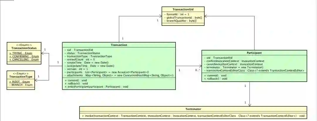 这里,需要特别关注 TransactionContext 事务上下文,因为我们需要远程调用服务的参与者时通过参数的形式传递事务给远程参与者。在 tcc-transaction 中,一个事务org.mengyun.tcctransaction.Transaction可以有多个参与者org.mengyun.tcctransaction.Participant 参与业务活动。其中,事务编号 TransactionXid 用于唯一标识一个事务,它使用 UUID 算法生成,保证唯一性。当参与者进行远程调用时,远程的分支事务的事务编号等于该参与者的事务编号。通过事务编号的关联 TCC confirm / cancel 方法,使用参与者的事务编号和远程的分支事务进行关联,从而实现事务的提交和回滚。事务状态 TransactionStatus 包含 :尝试中状态 TRYING(1)、确认中状态 CONFIRMING(2)、取消中状态 CANCELLING(3)。此外,事务类型 TransactionType 包含 :根事务 ROOT(1)、分支事务 BRANCH(2)。当调用 TransactionManager#begin() 发起根事务时,类型为 MethodType.ROOT,并且事务 try 方法被调用。调用 TransactionManager#propagationNewBegin() 方法,传播发起分支事务。该方法在调用方法类型为 MethodType.PROVIDER 并且 事务 try 方法被调用。调用 TransactionManager#commit() 方法提交事务。该方法在事务处于 confirm / cancel 方法被调用。类似地,调用 TransactionManager#rollback() 方法,取消事务。
