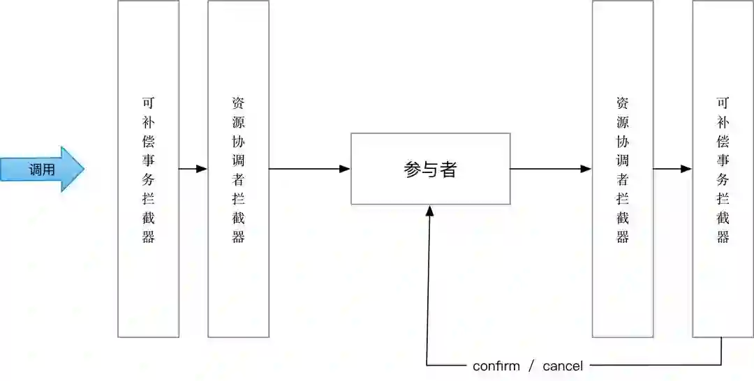 对于 tcc-transaction 框架的实现,我们来了解一些核心思路。tcc-transaction 框架通过 @Compensable 切面进行拦截,可以透明化对参与者 confirm / cancel 方法调用,从而实现 TCC 模式。这里,tcc-transaction 有两个拦截器。
