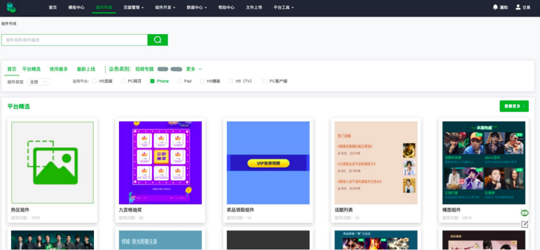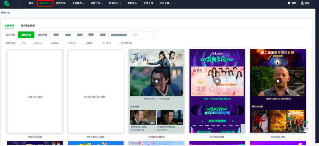 内容上我们建设了模板中心和组件市场。编辑搭建页面时,挑选模板中心中较合适的模板稍加修改即可。