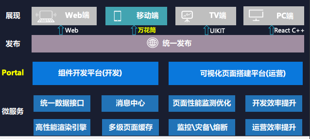 低代码平台架构的核心为第三层 Portal,由两块组成:面向组件开发同学的组件开发平台和编辑使用的页面可视化搭建平台。页面可视化搭建平台实现完全零代码,组件开发平台只需要用少量代码就可以开发组件,通常给外包人员使用。