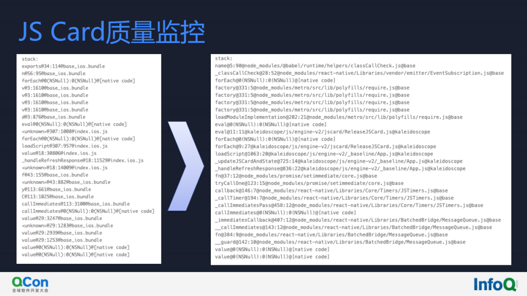 业务方开发的 JS Card 代码问题不好定位。我们实现了 JS Card 运行时异常的捕获和投递,建设了统一的 JS Card 打包服务。利用该打包服务,可获取所有 source map 文件,可在爱奇艺的 APM 系统中还原崩溃栈中被混淆的 JS 代码符号,效果如下所示: