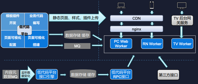 后端架构如下所示。页面数据来自于编辑们搭建页面的配置信息和内容原数据的数据流(虚线下的流程)。两类数据一静一动,会在不同端的 Worker Service 上融合,返回给不同用户端。