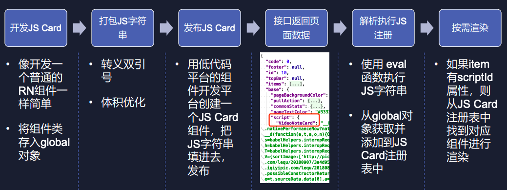 参考 HTML 中通过夹带标签编写 JS 实现动态效果,为提高业务适应性,我们在 JSON 中也添加了 JS 脚本。针对无法用 JSON 描述的非通用需求场景,我们允许以 Card(列表项)为粒度直接用 RN 开发,打包成 JS 字符串之后和其他 JSON 数据一起下发,动态加载运行。Card 为前文中的 Item 被渲染后的带界面的占有一定高度的实体。