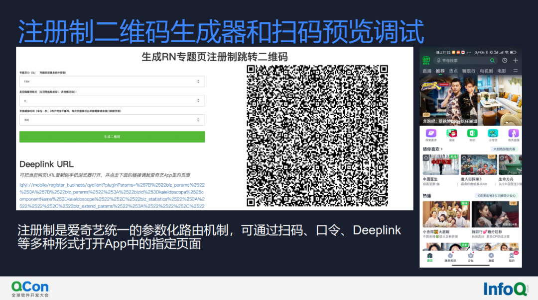 我们开发了注册制二维码生成器,生成 RN 专题页跳转二维码。扫码后即可预览,启动 RN 的 JS 远程调试工具后,即可调试引擎或 JS Card。注册制是爱奇艺统一的参数化路由机制,如下图所示,在页面中设置专题页参数,用爱奇艺 App 扫描生成的二维码,即可打开对应的专题页。