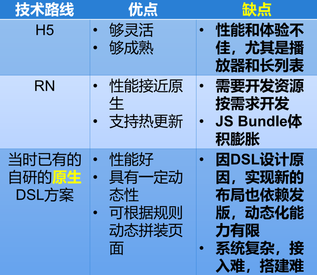 为实现以上需求,我们对比了 H5、RN 和当时爱奇艺已有的自研的原生 DSL 方案的优缺点,综合成本、性能、动态性等多方面的考虑,决定自研一个结合 RN 和 DSL 的新方案:Kaleidoscope 引擎(万花筒引擎)。