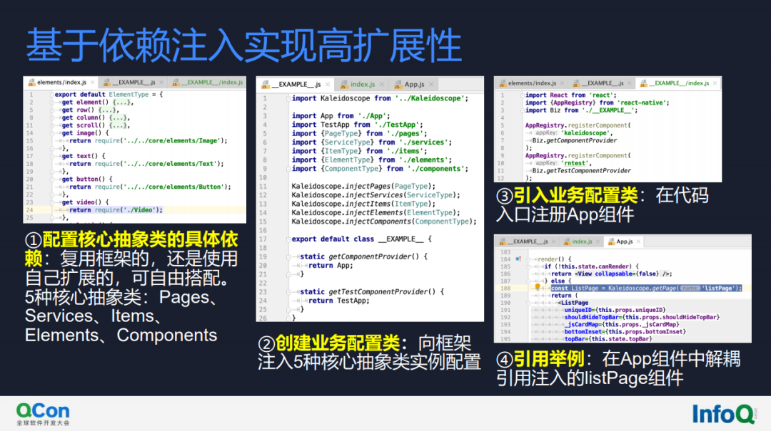 不同业务方前来对接,但是需求不同时,爱奇艺采用了剥离核心功能,支持业务方按需裁剪、扩展和定制的思路。我们采用依赖注入的方式实现和使用所有的 Page、Item 和 Element 组件,打破了组件之间的强依赖。业务方可自由组合复用已有的组件,自定义组件,实现过程如下图所示: