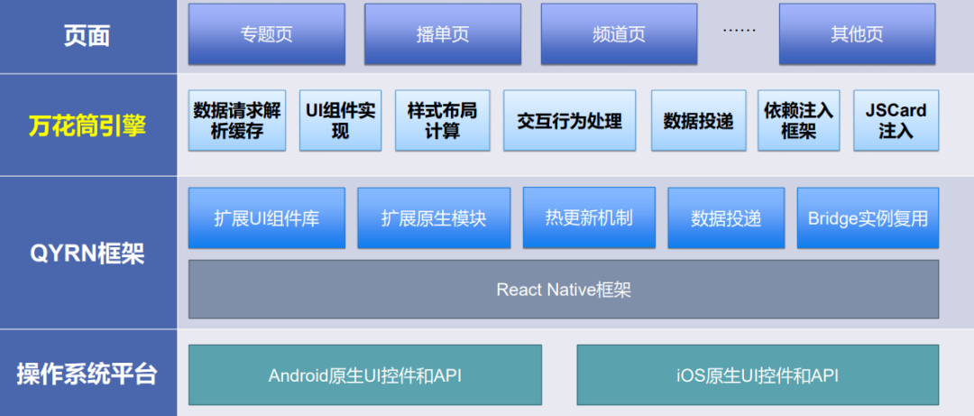 前端架构中 Kaleidoscope 引擎处于下面架构图的第二层,主要负责数据的下载、缓存和解析,依赖于 QYRN 框架。QYRN 框架是爱奇艺以 RN 官方框架为基础封装的框架,它丰富了官方框架的组件库,扩展了 UI 组件和原生模块,实现了热更新机制、数据投递和 Bridge 实例复用。