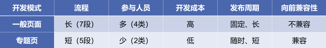 专题页开发流程与一般页面在流程、人员、成本上、发布周期、向前兼容性上均存在差异。专题页开发只有提出需求、视觉设计、搭建页面、自测验证、投放上线五步。其中,需求是由编辑提出的。