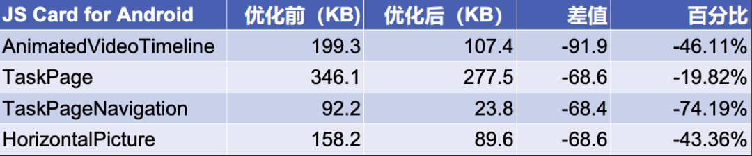 JS Card 方面,我们在业务分包后再次分包,用自研的 JS Card 专用打包工具进行打包,将 JS Card 中万花筒引擎自身已经包含的依赖库在打包的时候剔除。经过层层分包爱奇艺已上线的 JS Card 如下图所示,体积明显下降。