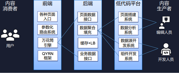 Kaleidoscope 整体架构图分为前端、后端和低代码平台三部分。前端面向内容消费者,后端和低代码平台面向内容生产者以及部分开发人员。