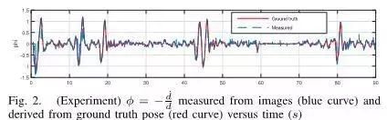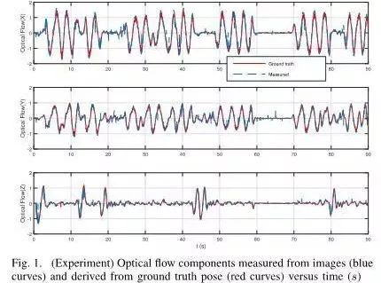 图1.(实验)从图像中测量的光流分量(蓝色线)和真实值(红色线)对比