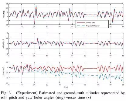 图3.估计值与真实值在翻滚角、俯仰角、偏航角上的对比