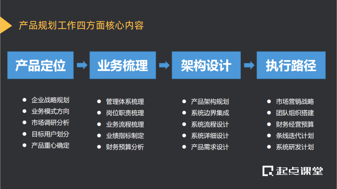 具体可拆分为以下4个环节:产品定位➝业务梳理➝架构设计➝执行路径。