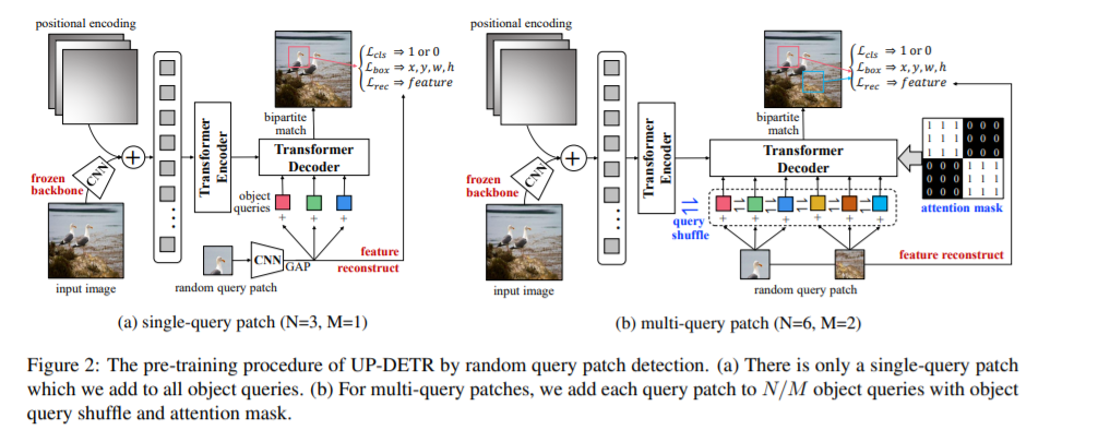通过一个Transformer编码器-解码器架构的目标检测transformers (DETR)取得了与Faster R-CNN相匹配的性能。受预训练transformer在自然语言处理中取得的巨大成功的启发,我们提出了一种基于随机查询补丁检测的无监督预训练目标检测任务。具体地说,我们从给定的图像中随机裁剪小块,然后将它们作为查询输入解码器。该模型经过预训练,从原始图像中检测出这些查询补丁。在预训练,我们解决了两个关键问题:多任务学习和多查询定位。(1)为了权衡在前置任务中分类和定位的多任务学习,我们冻结CNN骨干,提出一个与patch检测联合优化的patch特征重构分支。(2)为实现多查询定位,我们引入了单查询补丁的UP-DETR ,并将其扩展为具有对象查询洗牌和注意掩码的多查询补丁。在我们的实验中,UP-DETR算法在PASCAL VOC和COCO数据集上具有更快的收敛速度和更高的精度,显著提高了DETR算法的性能。代码很快就会发布。
