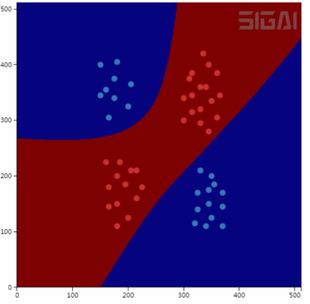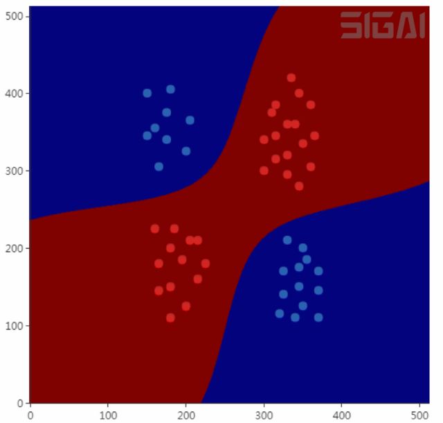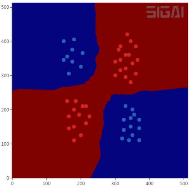 然后用梯度下降法更新。神经网络是一个判别模型,并且是非线性模型,它既支持分类问题,也支持回归问题,并且支持多分类问题。下图是用神经网络对异或问题的分类结果: