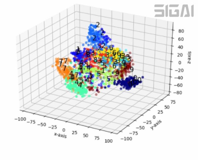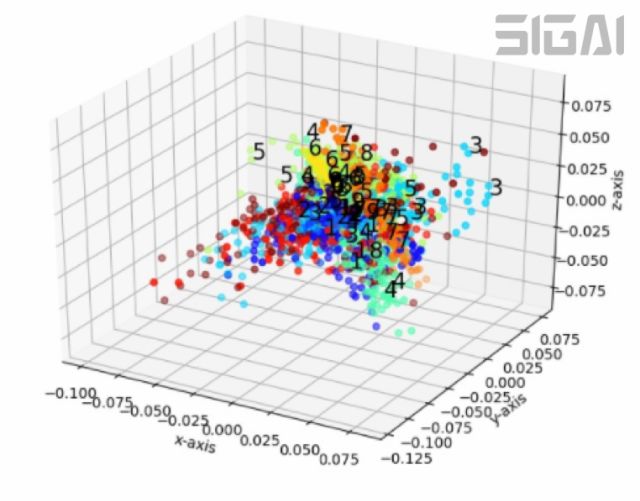 这里的权重和上一个优化问题的值相同,在前面已经得到。下图为用LLE算法将手写数字图像投影到3维空间后的结果: