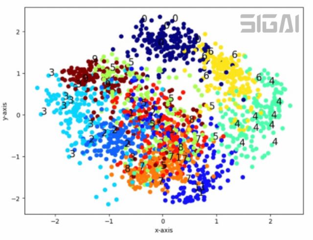 矩阵W的列是我们要求解的基向量。散度矩阵是实对称矩阵,因此属于不同特征值的特征向量是正交的。下图是主成分分析对手写数字图像的降维结果: