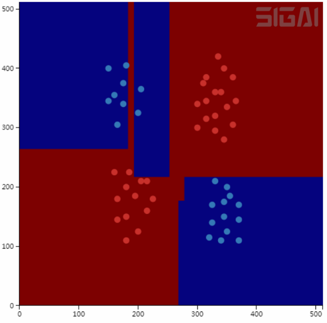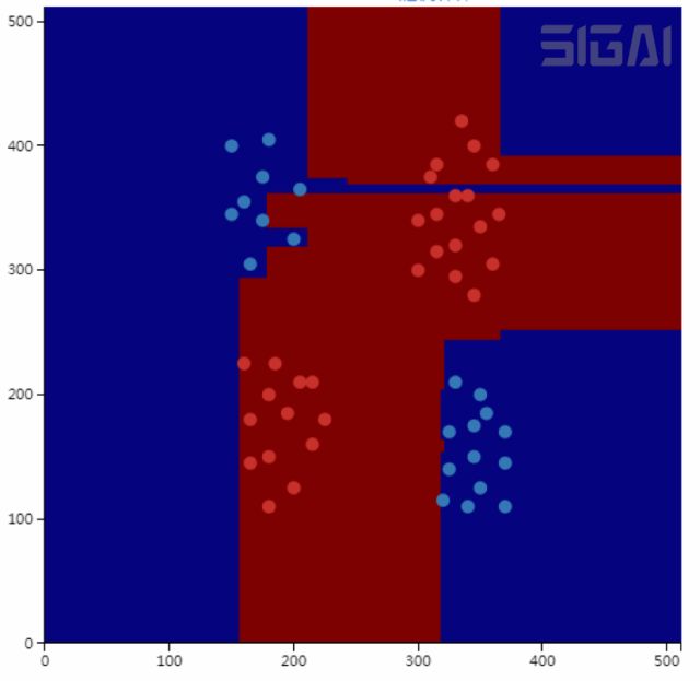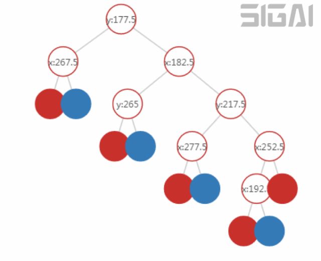 下图是决策树进行空间划分的一个例子。在这里有红色和蓝色两类训练样本,用下面两条平行于坐标轴的直线可以将这两类样本分开: