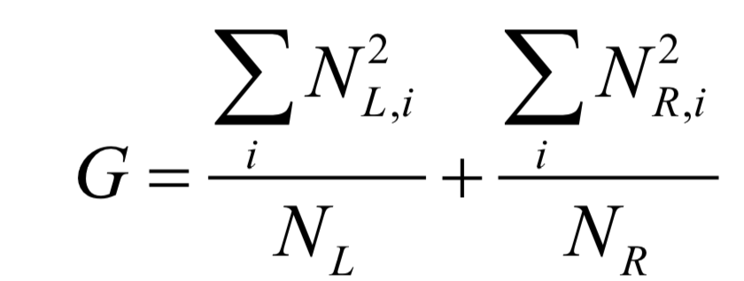 对于分类与回归树,训练每个节点时的目标是要让Gini不纯度最小化,这等价于让下面的值最大化: