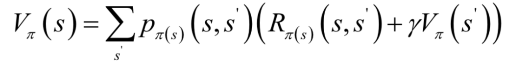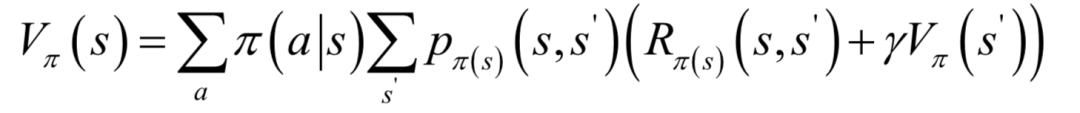 如果每次执行一个动作进入的下一个状态是确定的,则可以直接用上面的累计回报计算公式。如果执行完动作后进入的下一个状态是随机的,则需要计算各种情况的数学期望。为此定义状态价值函数的概念,它是在某个状态s下,按照策略执行动作,累计回报的数学期望。状态价值函数的计算公式为: