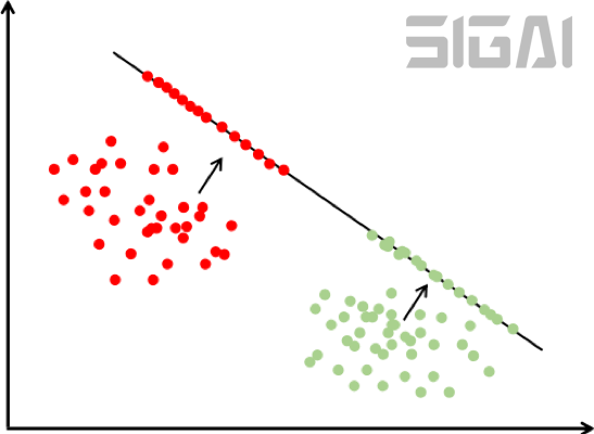 投影的目标是同一类样投影后的结果向量差异尽可能小,不同类的样本差异尽可能大。直观来看,就是经过这个投影之后同一类的样本进来聚集在一起,不同类的样本尽可能离得远。下图是这种投影的示意图: