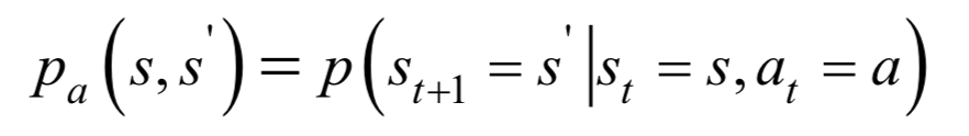 其中S和A分别为状态和动作的集合。假设t时刻状态为st,智能体执行动作a,下一时刻进入状态st+1。下一时刻的状态由当前状态以及当前采取的动作决定,是一个随机性变量,这一状态转移的概率为: