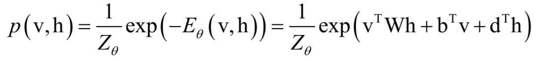 可见节点用向量表示为v,隐藏节点用向量表示为h。任意可见节点和隐藏节点之间都有边连接。(v, h)的联合概率服从玻尔兹曼分布,联合概率定义为: