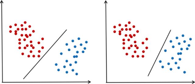 支持向量机是对线性分类器的改进,加上了最大化分类间隔的约束,另外还使用了核技术,通过非线性核解决非线性问题。一般情况下,给定一组训练样本可以得到不止一个可行的线性分类器,下图就是一个例子: