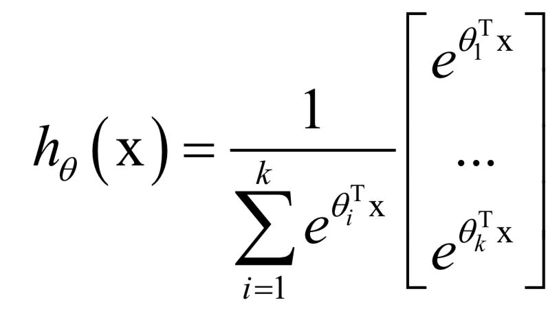 logistic回归只能用于二分类问题,将它进行推广可以得到处理多类分类问题的softmax回归。softmax回归按照下面的公式估计一个样本属于每一类的概率: