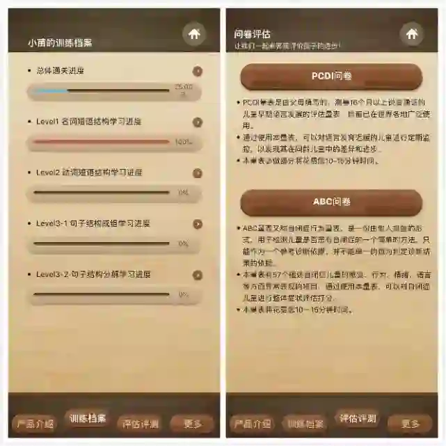 为了更好地了解孩子的训练成果,“新雨滴”的家长中心中还设有“训练档案”和“问卷评估”两个模块,可以帮助父母直观地了解孩子的课程进度以及整体的训练情况。